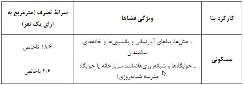 جدول ۱-۵-۶-۳ : سرانه تصرف در بناهای مختلف (بر حسب مترمربع به ازای هرنفر)