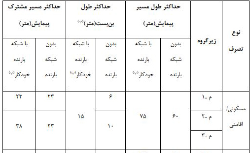 ت: در این تصرف ها در صورتی که بار تصرف کمتر از ۳۰ نفر باشد، بدون اسـتفاده از شـبکه بارنـده خودکـار، طـول مسـیر مشـترک میتواند حداکثر ۳۰ متر در نظر گرفته شود.